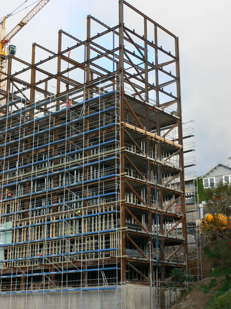 Moment frames are a popular system (Figure 3). Their columns and beams resist earthquake shaking by being connected strongly (refer Article 6). Frames offer the greatest freedom for planning interior spaces and providing windows. Unfortunately, moment frames are usually more flexible in earthquakes than the other two systems. They sway further to-and-fro and are more prone to damage. They are also more difficult to design and build properly, and are sensitive to construction errors. As for their construction materials, they are usually built of reinforced concrete or structural steel. Wooden frames can be used for low-rise buildings.