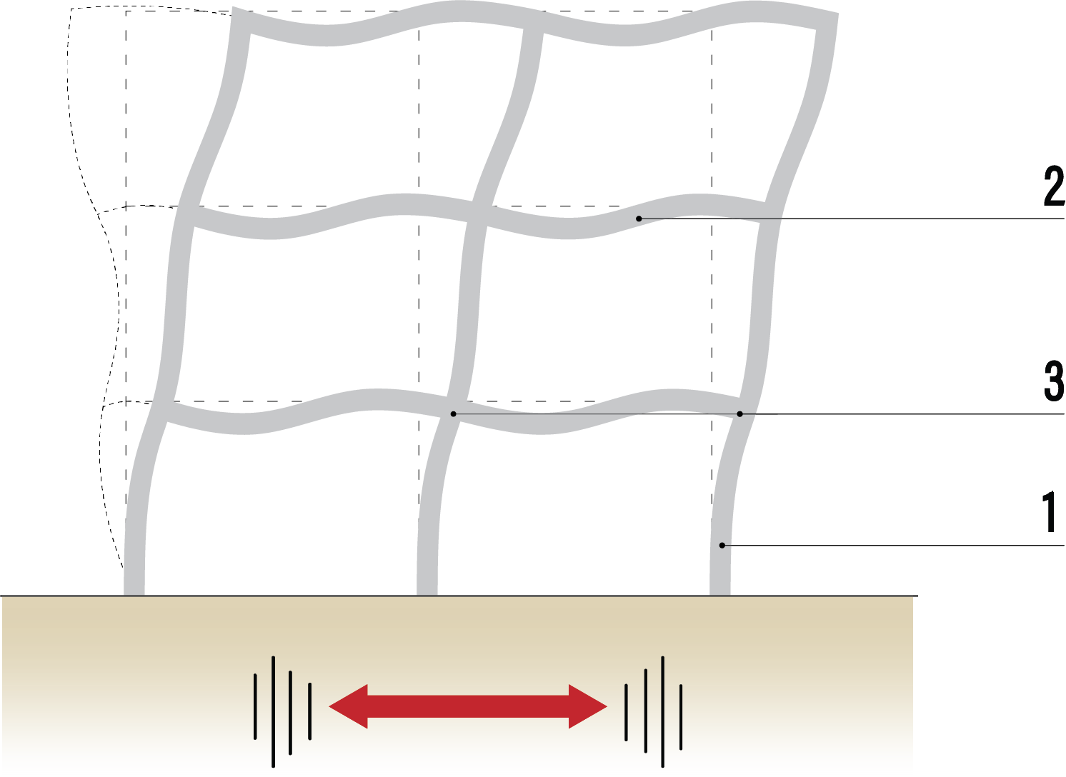 Figure 2. A column (1) and beam (2) frame building moves sideways during an earthquake. Note that both columns and beams bend. They are connected at strong joints where they meet (3).