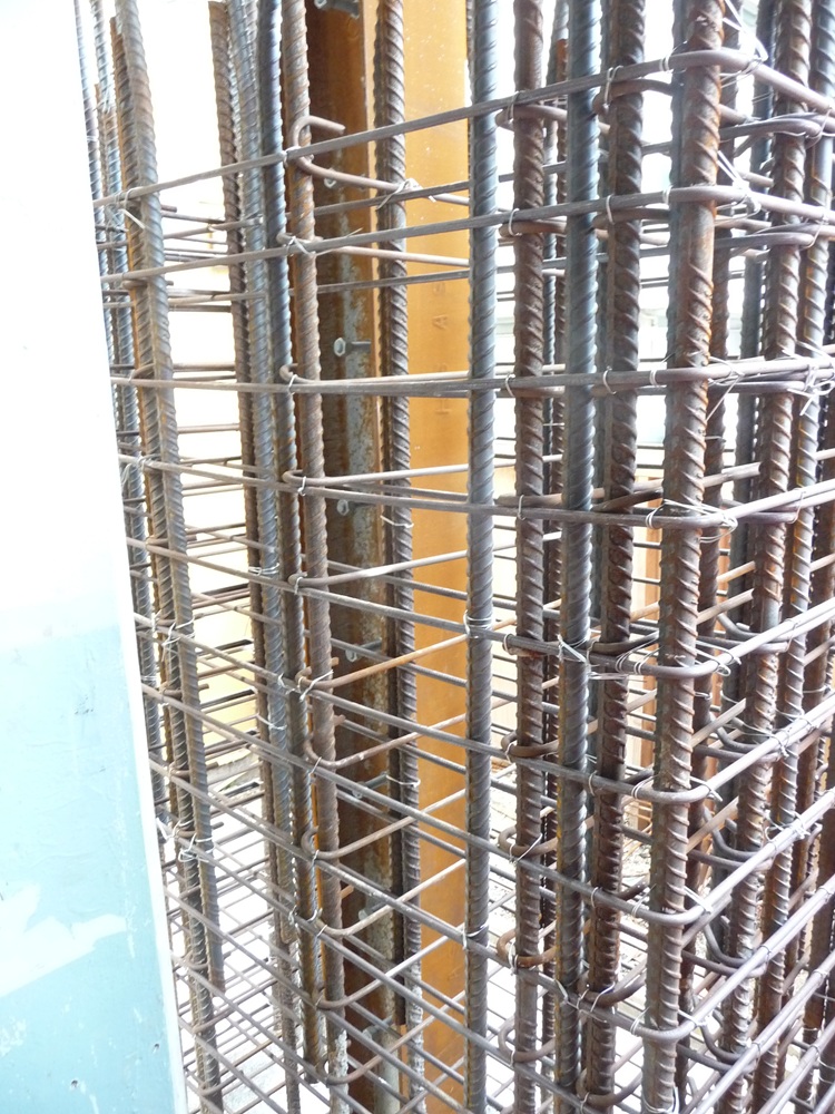 Figure 3. Column reinforcement is visible before the concrete is cast. The reinforcement consists of vertical bars that resist bending, and horizontal ties that stop the column concrete from disintegrating and dislodging.